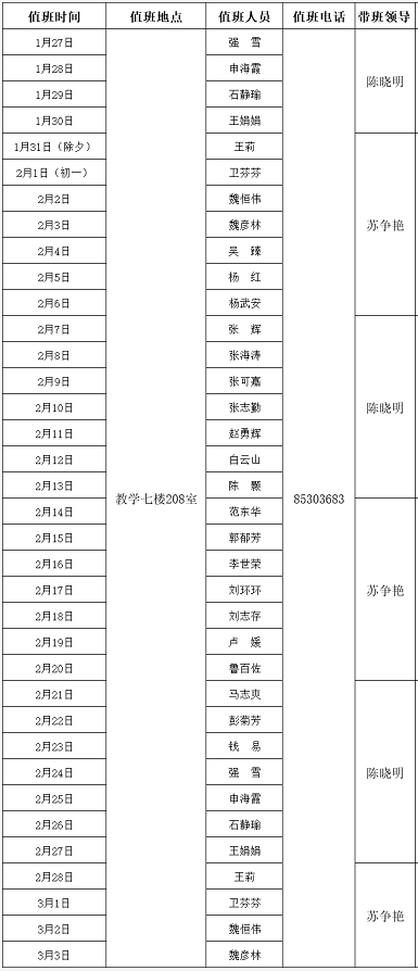 2.值班期间如遇有紧急、重要事项或突发事件,应立即联系带班领导并向学校总值班室(校务楼110室,85310005)报告并妥善处置;